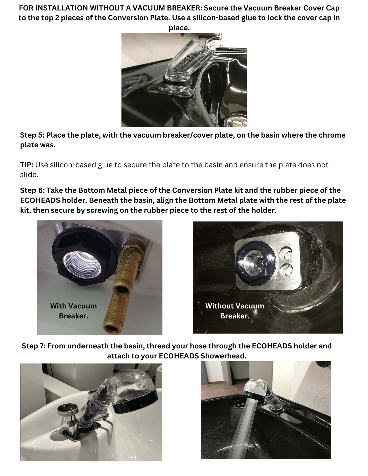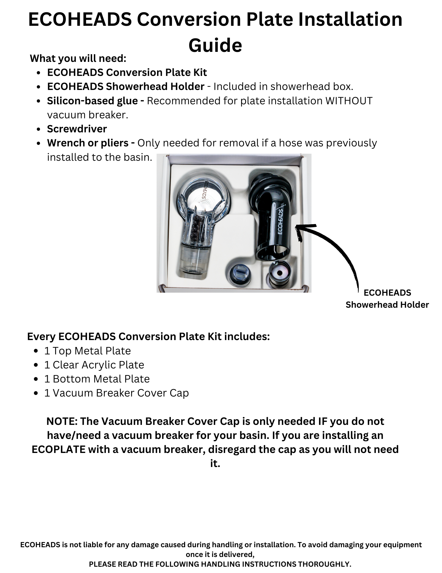 Every ECOHEADS Showerhead box comes with a black holder to attach to your basin. Between uses, the showerhead sits nicely in the holder, but this is more an aesthetic choice. Some basins can use the holder without converting the opening with the plate kit.